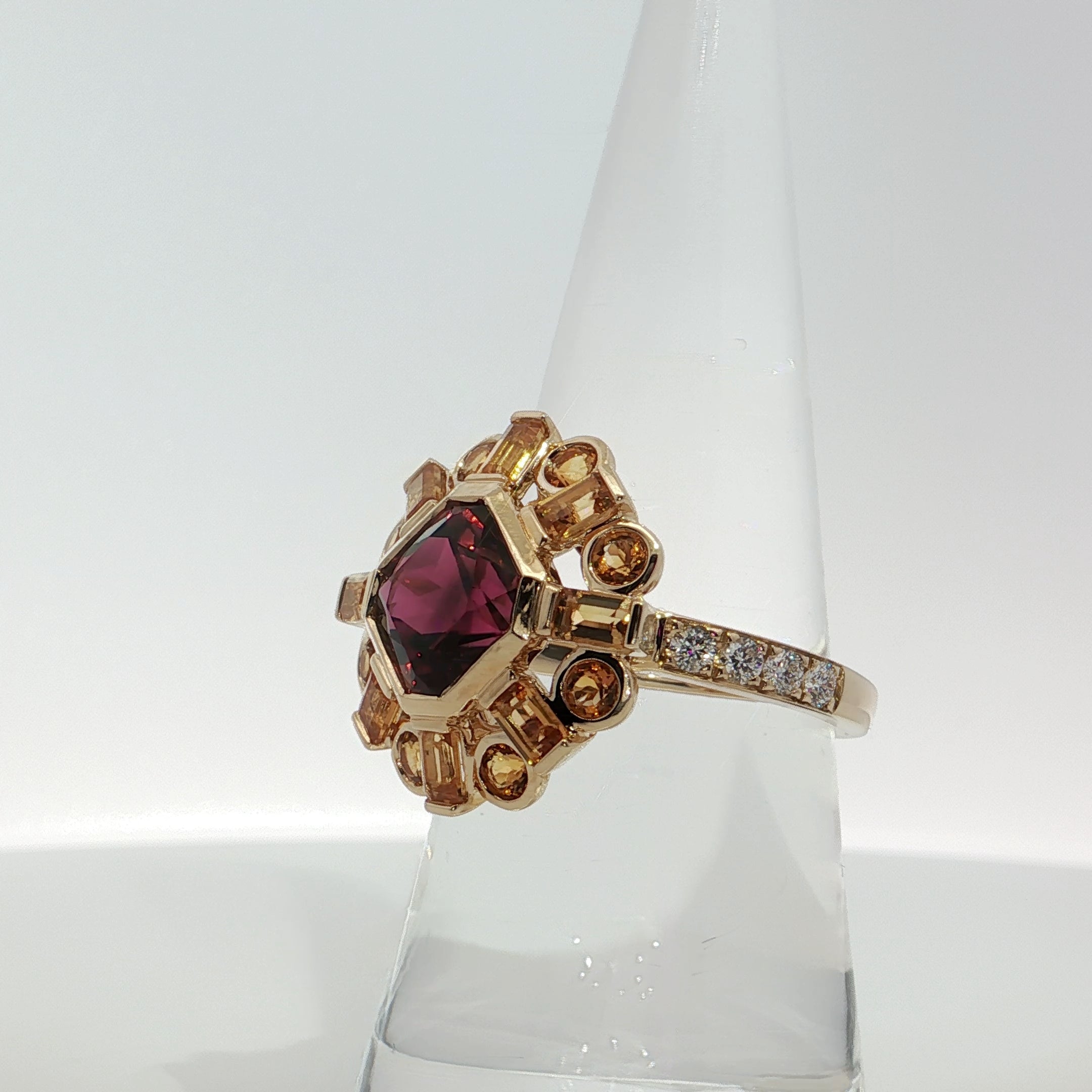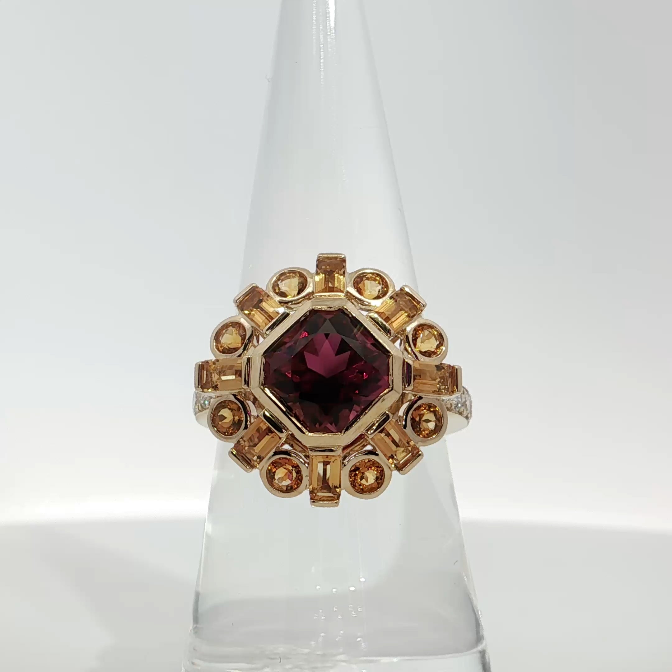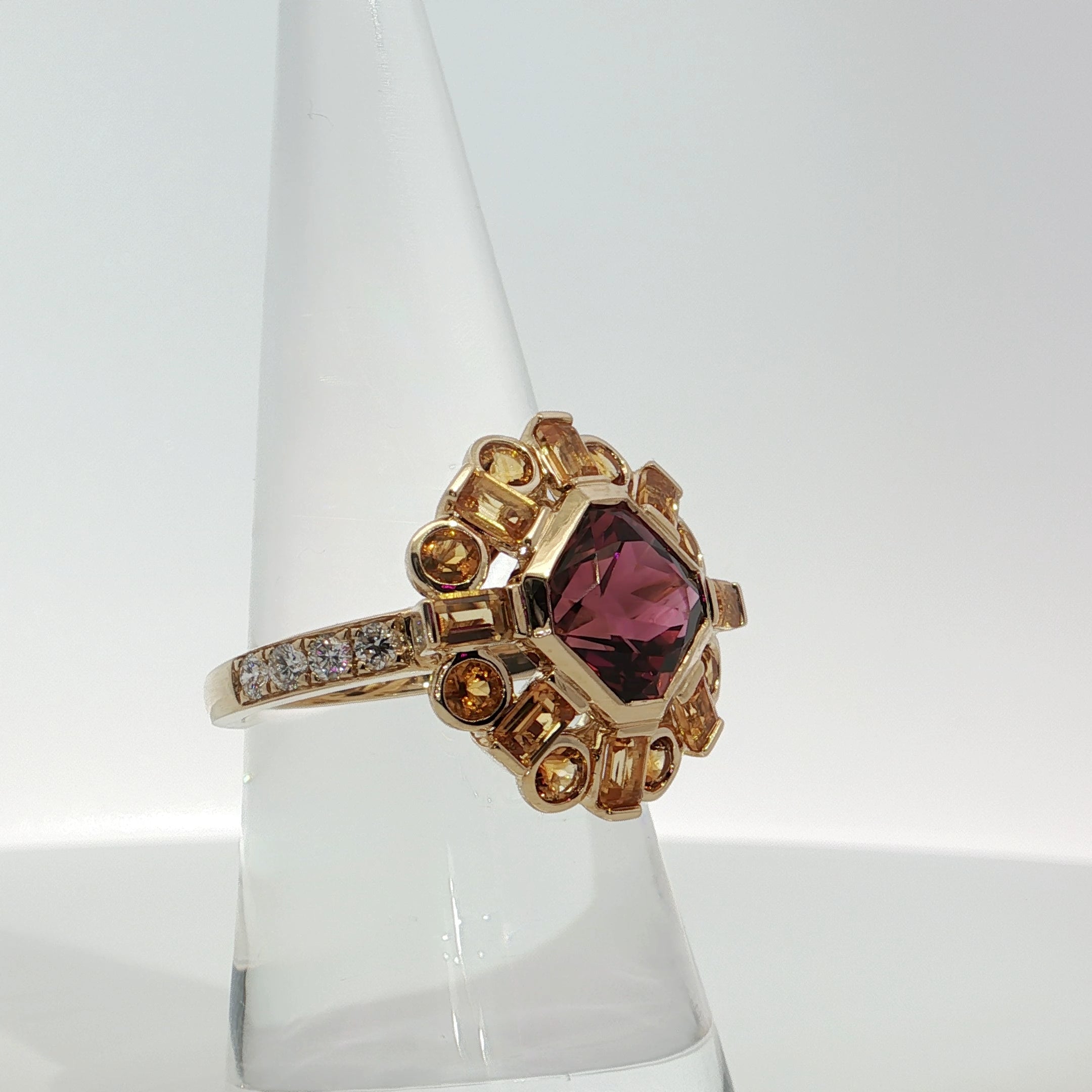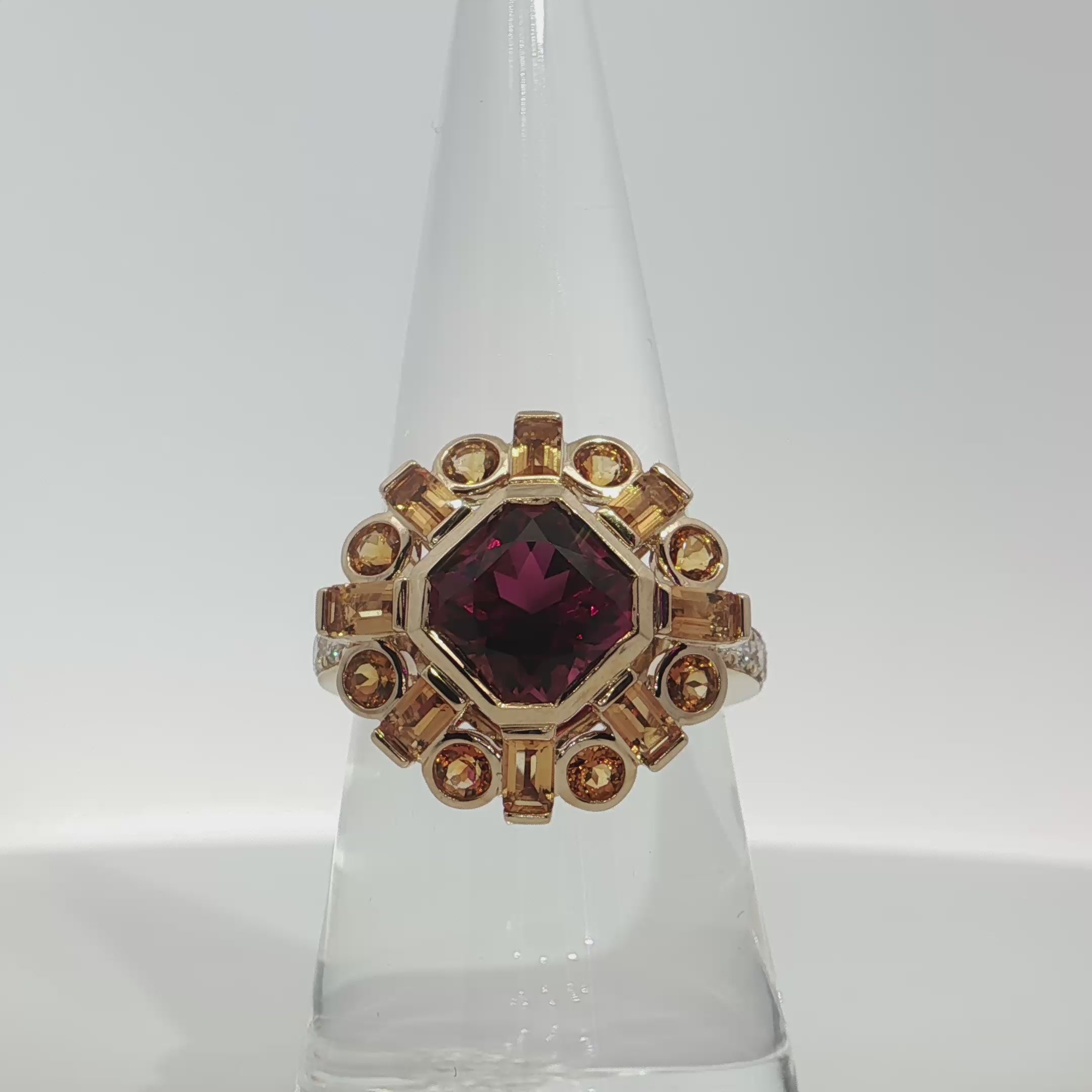 This captivating cocktail ring showcases an Asscher-cut tourmaline, glowing with a vivid reddish-purple hue. The center stone is framed by a radiant halo of citrines that enhance its depth and color. Set on a diamond-adorned band in warm yellow gold, this piece effortlessly blends timeless elegance with modern glamour—an unforgettable statement for any occasion.