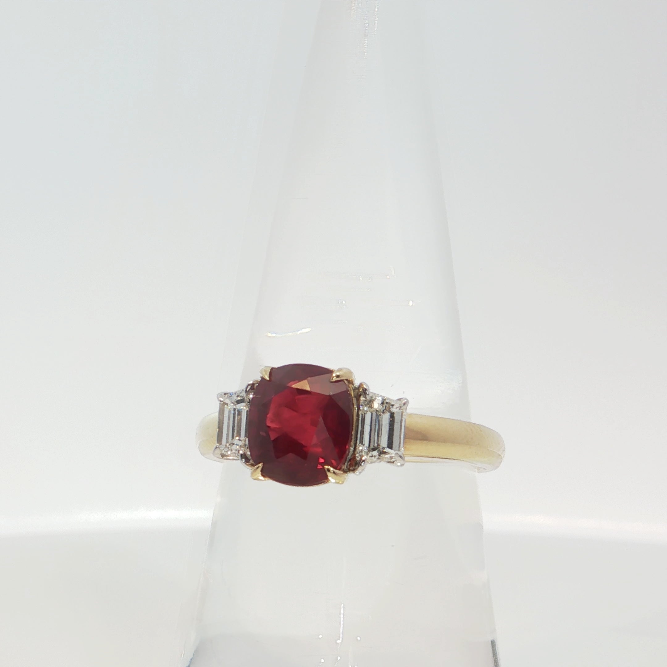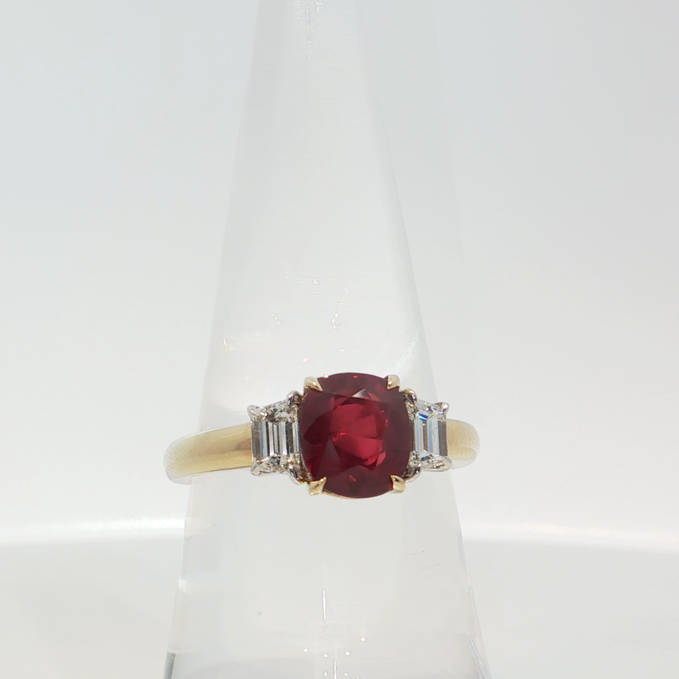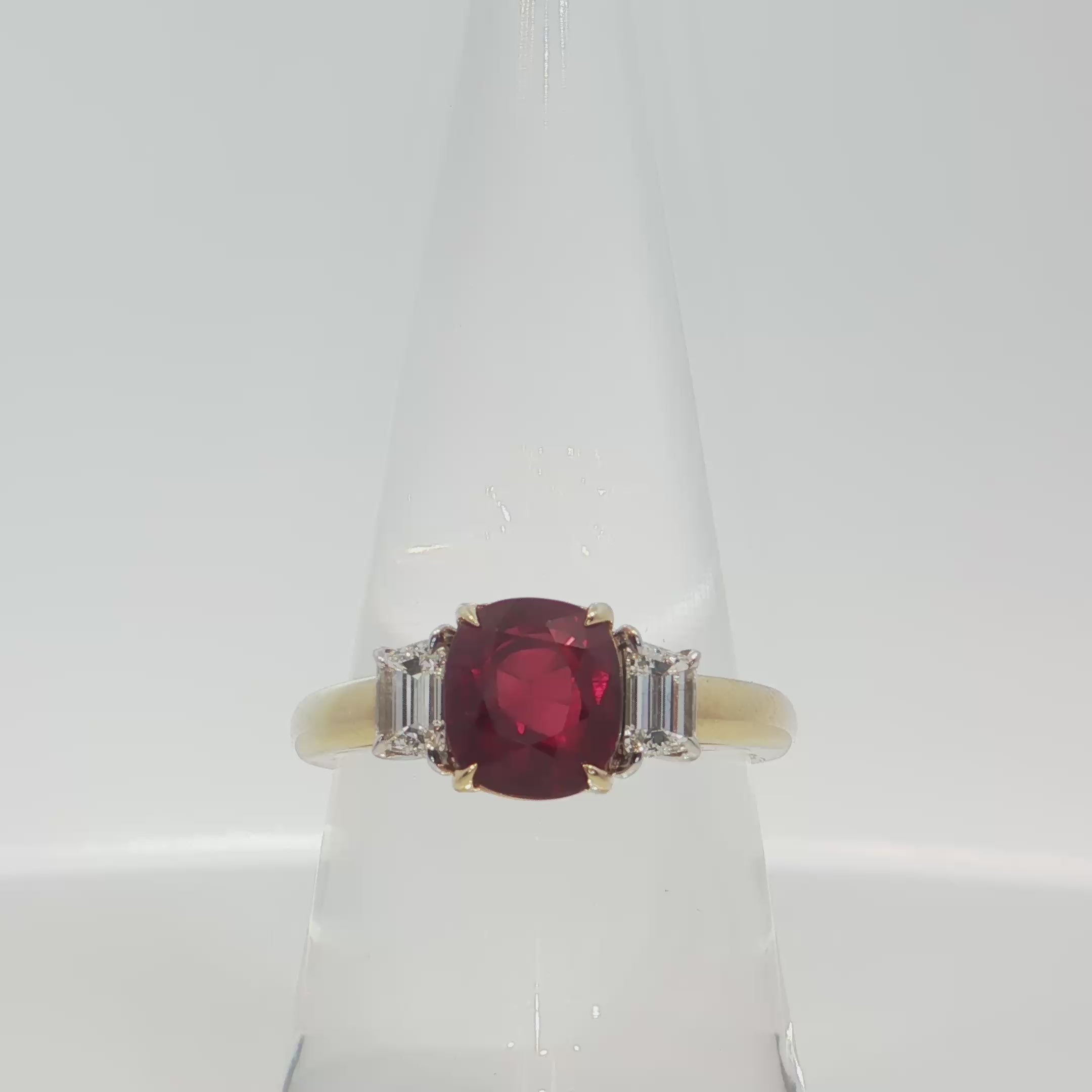 This exquisite ring showcases a captivating cushion-cut red gemstone at its center, elegantly set within a lustrous yellow gold band. Flanking the central gem are two refined baguette-cut diamonds, each accented by delicate triangular diamonds, forming a harmonious three-stone composition. The design beautifully highlights the depth of the central stone’s color while adding a sophisticated sparkle to the overall piece.