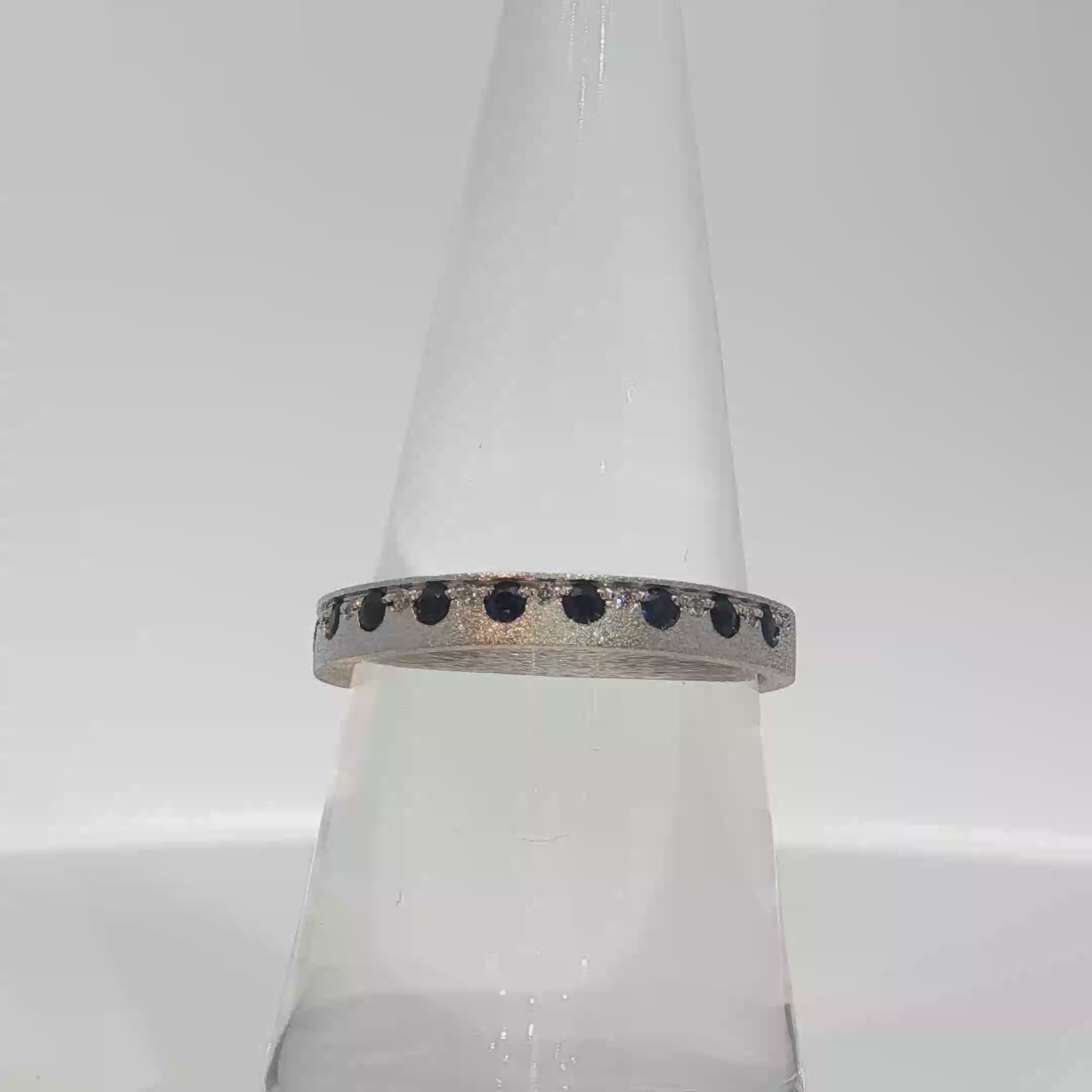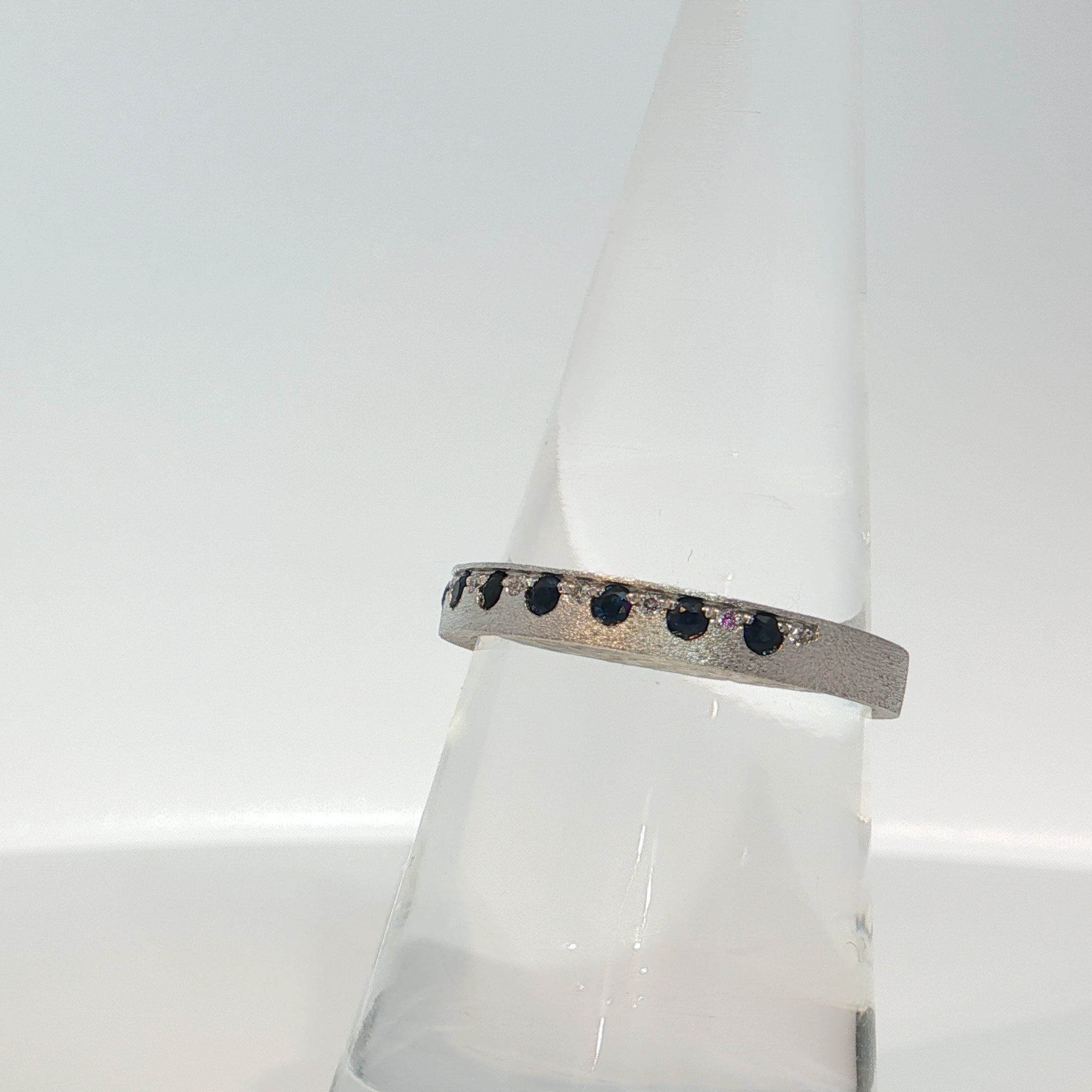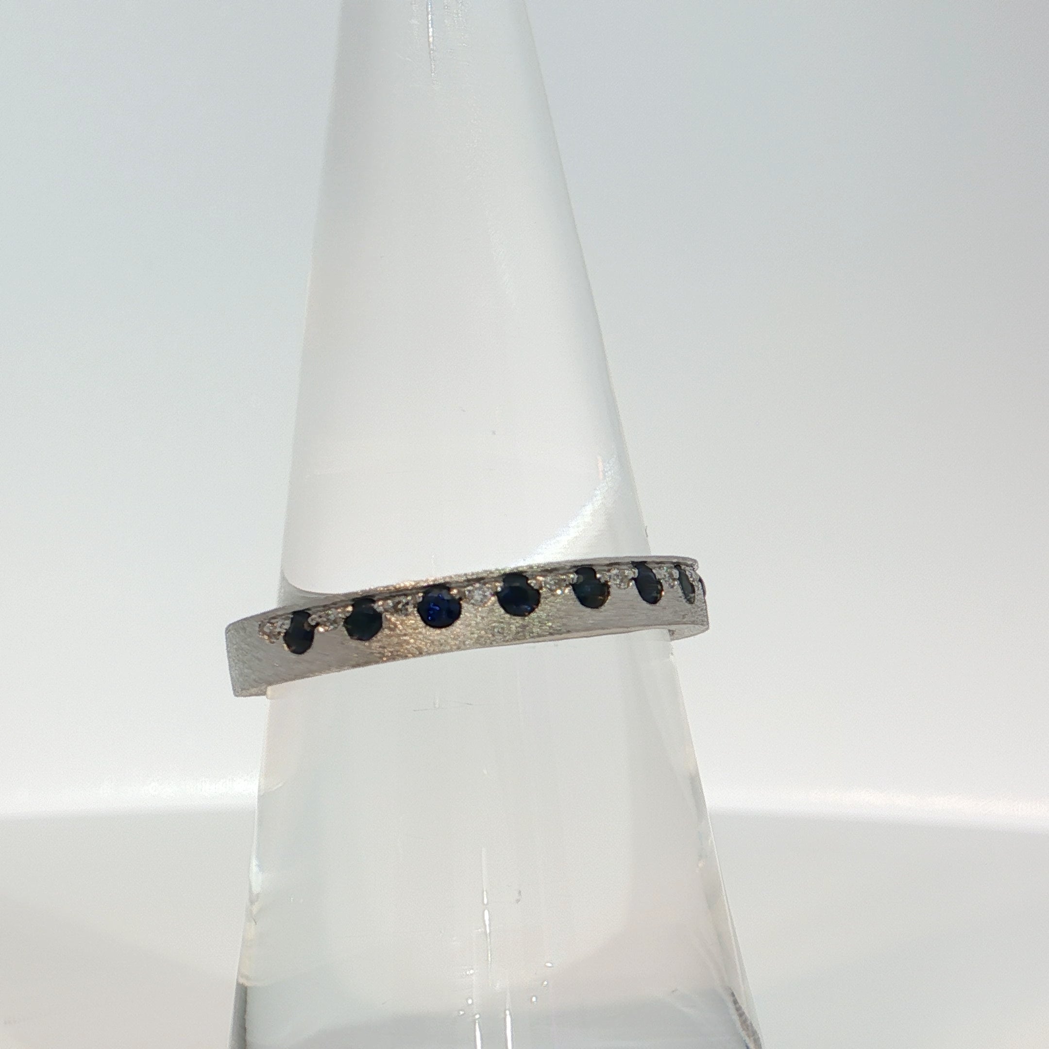 Enrich you ensemble with this elegant brushed white gold band ring. A sequence of deep blue sapphires is set seamlessly along the band, their rich color beautifully complemented by sparkling diamond accents. The brushed finish adds a modern, understated texture, creating a piece that balances contemporary sophistication with timeless allure.