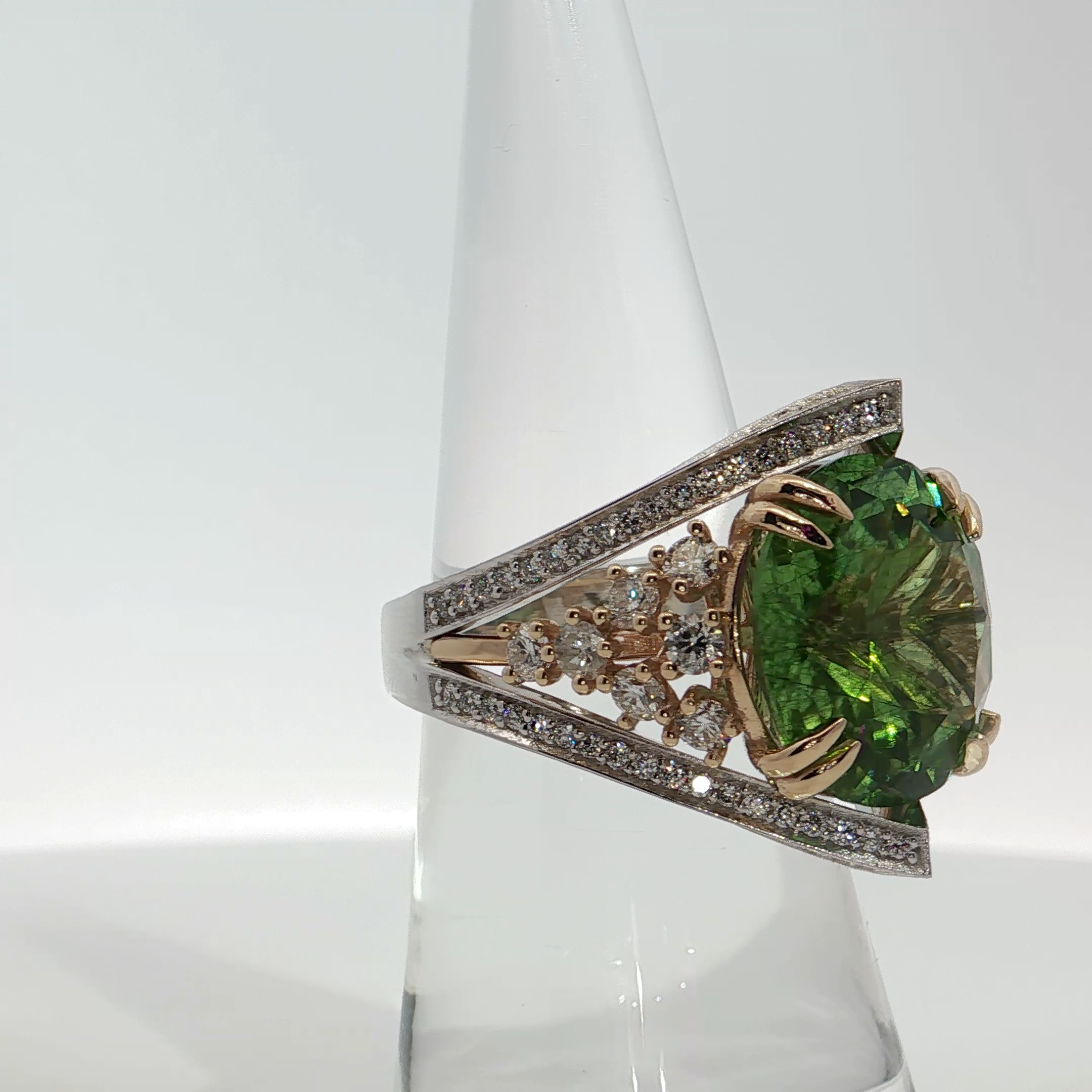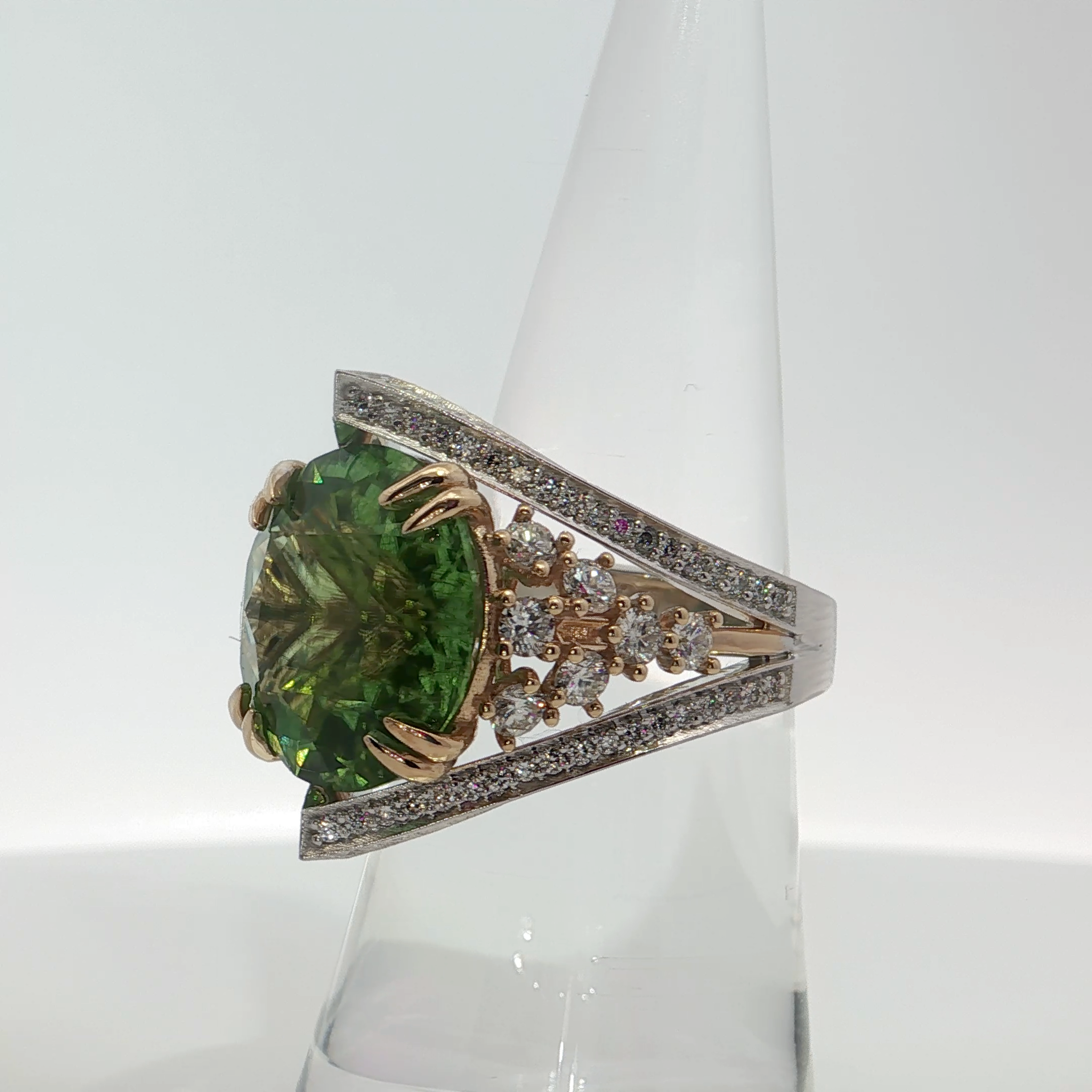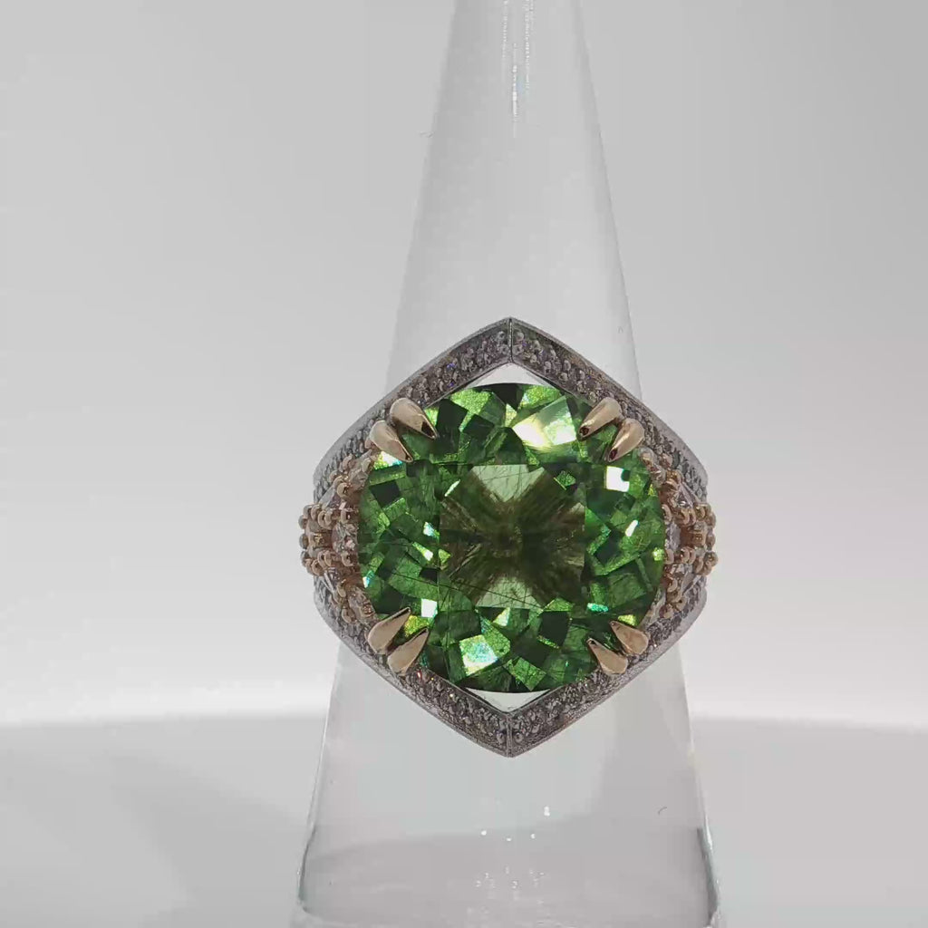 Make a bold statement with this striking gold cocktail ring. The ring features a magnificent round peridot with a mixed cut, showcasing a vibrant green hue. Its unique design is sure to turn heads and add a touch of sophistication to any ensemble.