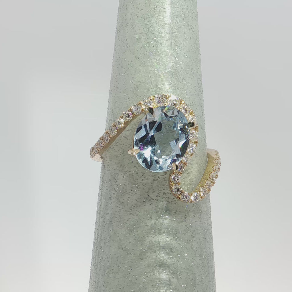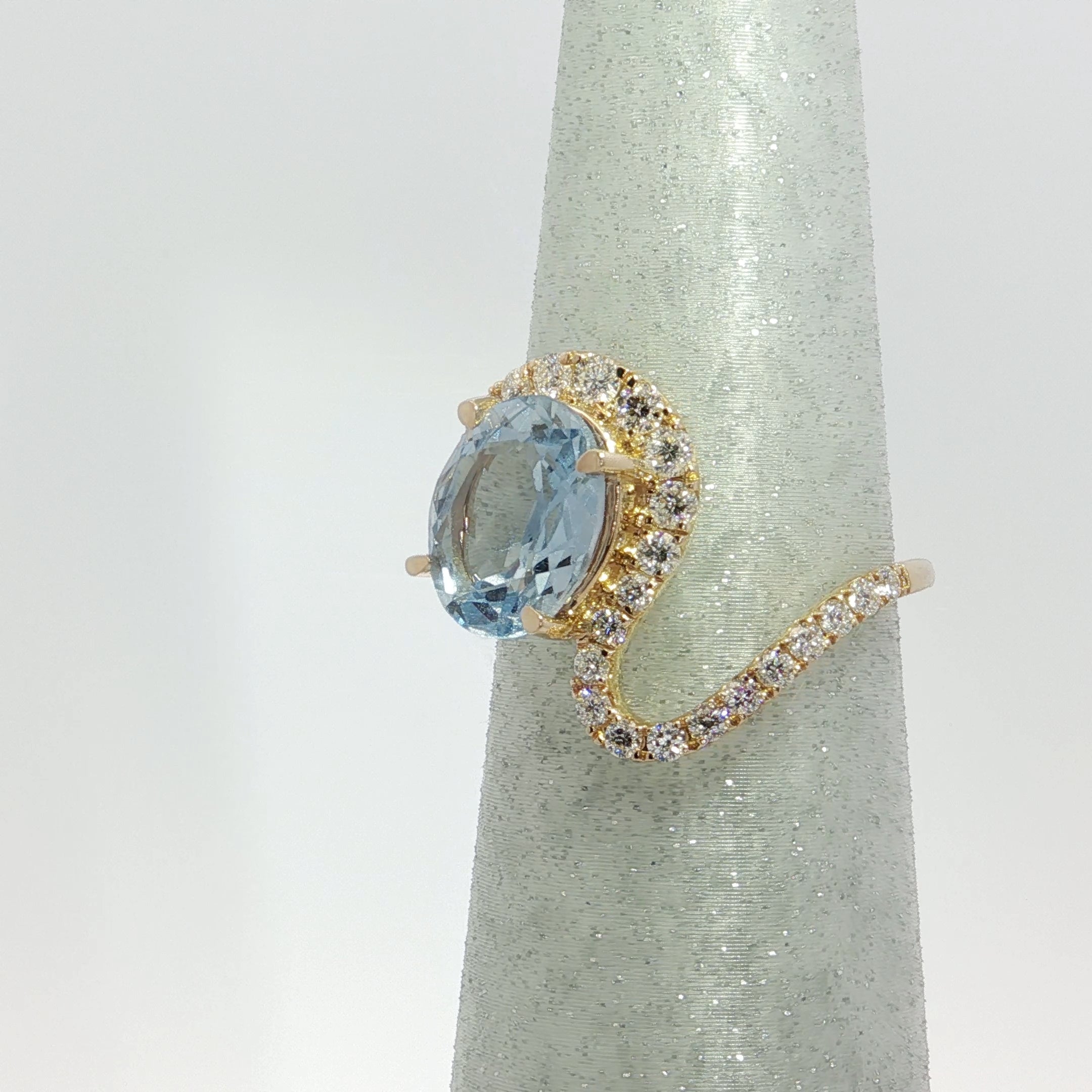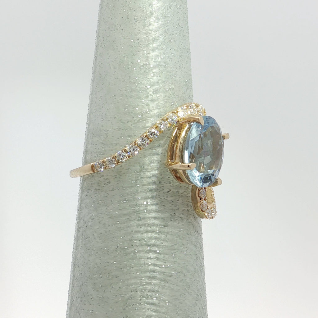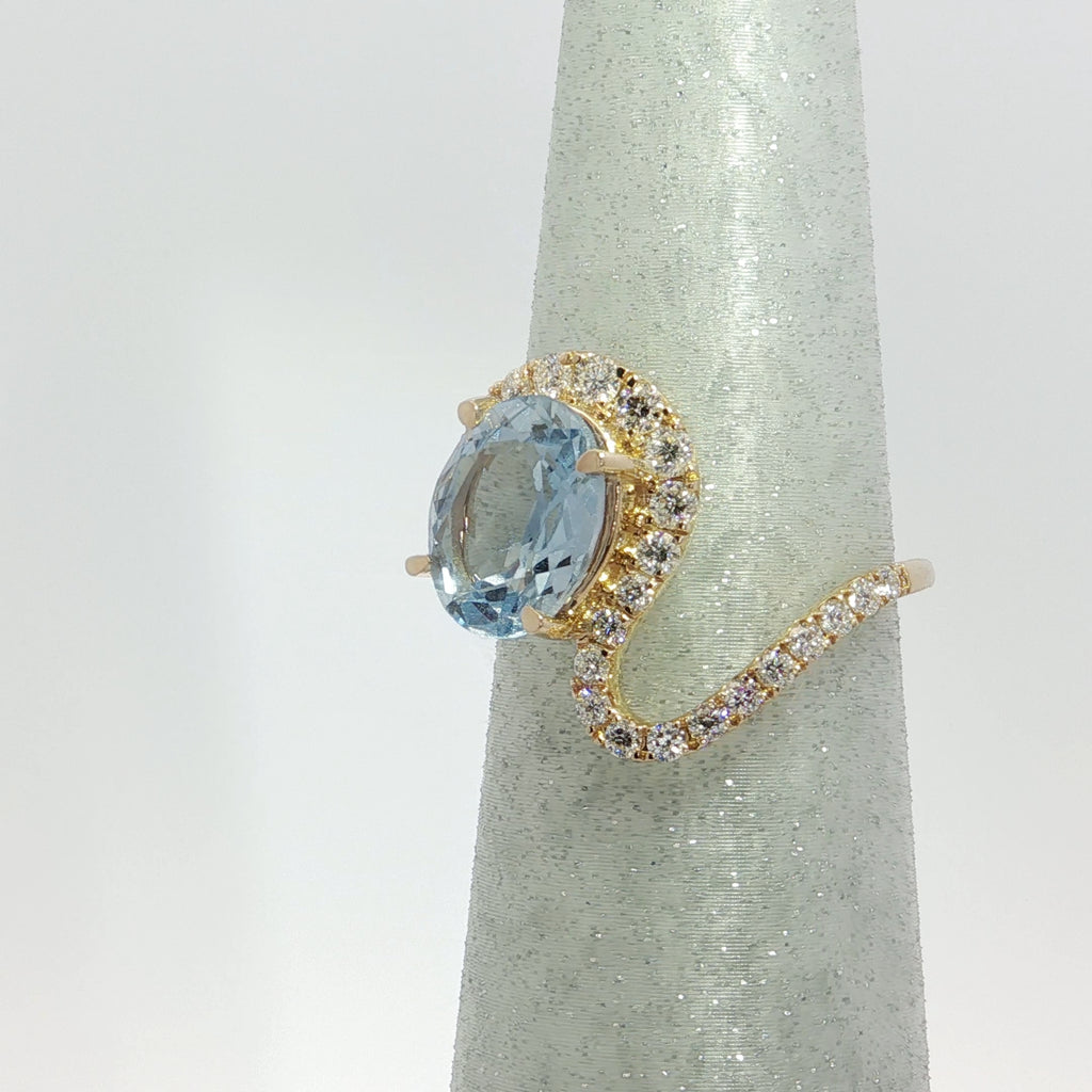 Indulge in the allure of this breathtaking gold cocktail ring, featuring a luminous oval aquamarine at its center. The gemstone is gracefully embraced by a flowing, asymmetrical band adorned with sparkling diamonds, creating a striking silhouette that feels both modern and timeless. With its captivating color, radiant brilliance, and sculptural shape, this piece is a truly distinctive addition to any jewelry collection.