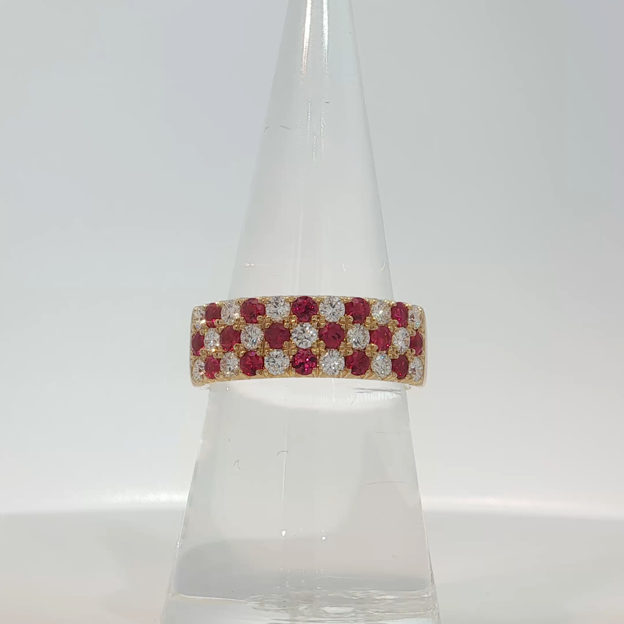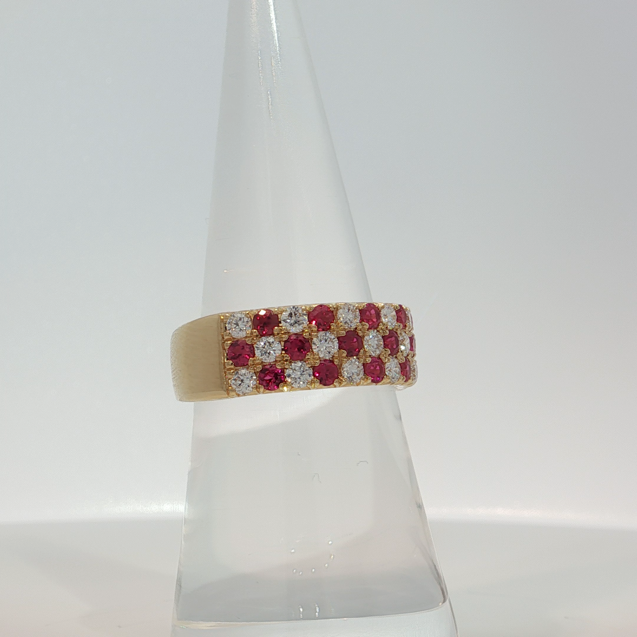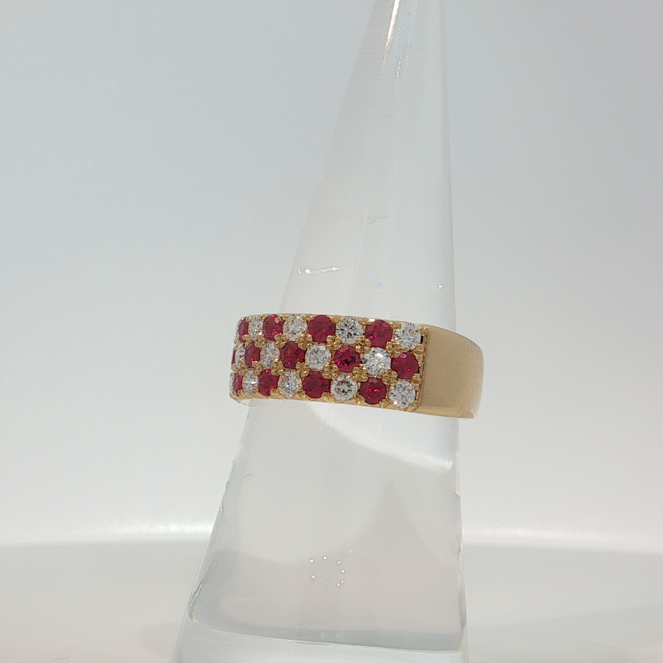 Indulge in the allure of this resplendent band ring, meticulously crafted in radiant yellow gold. Adorned with rows of fiery red rubies, each expertly cut into a brilliant round shape, creating a mesmerizing play of light and color. This statement piece exudes luxury and sophistication, perfect for adding a touch of glamour to any ensemble.