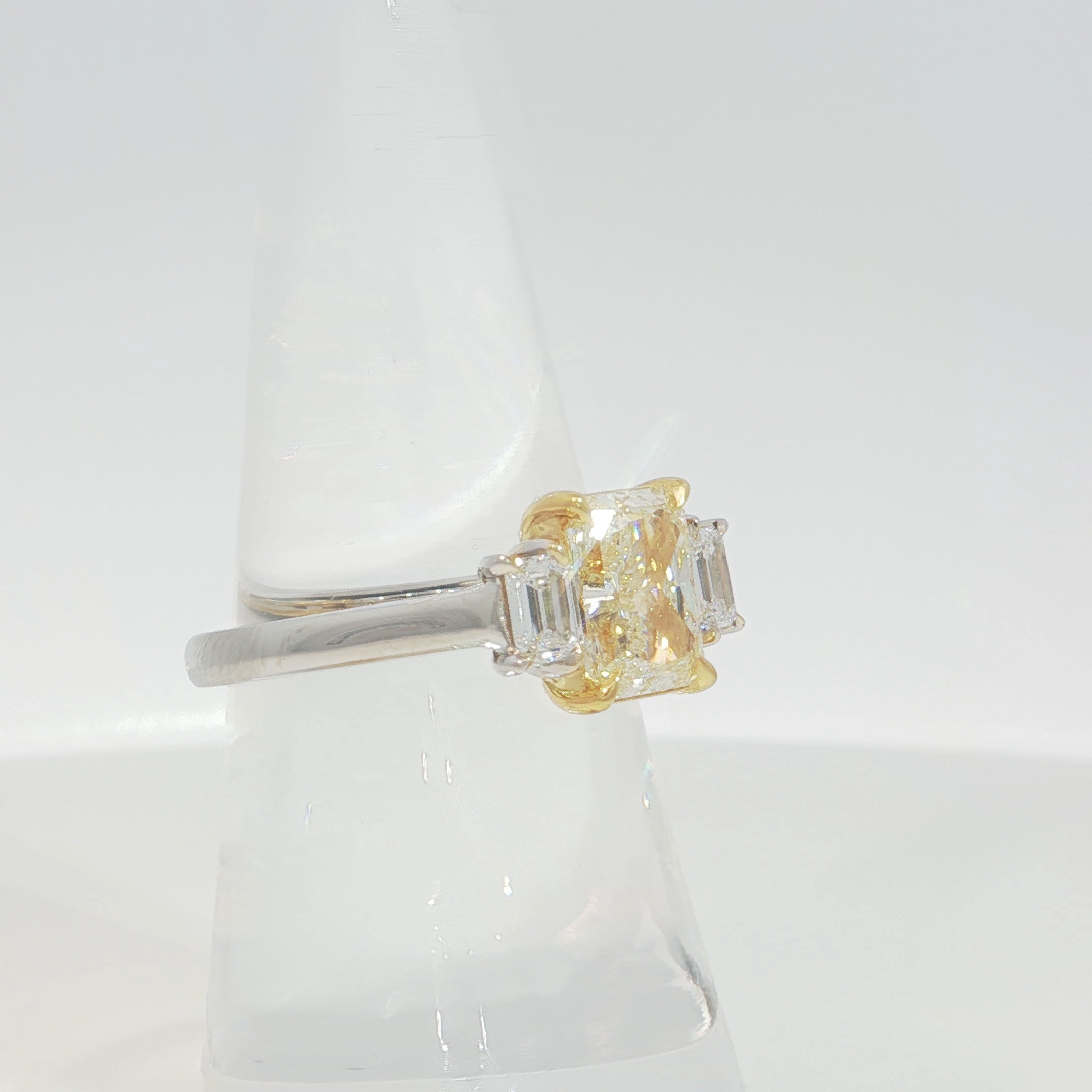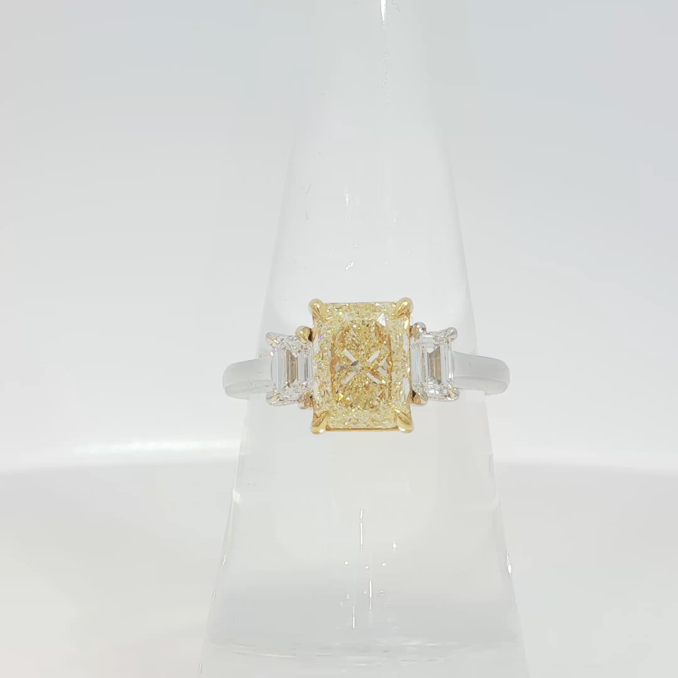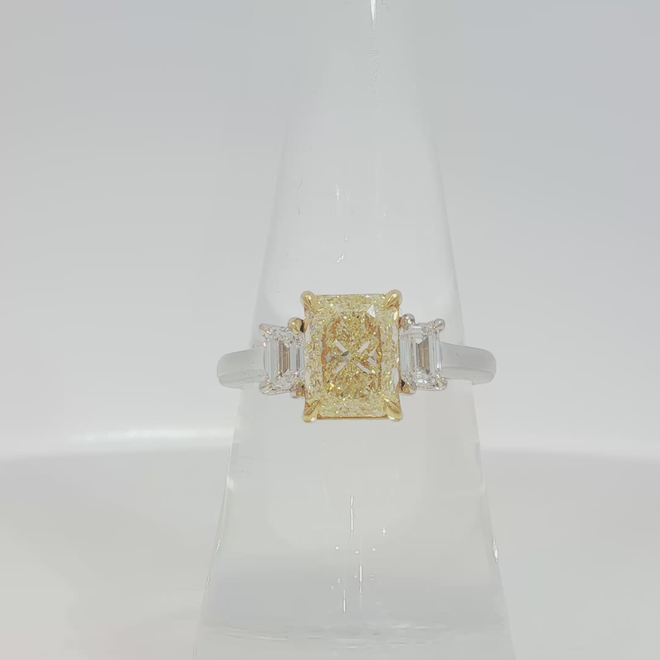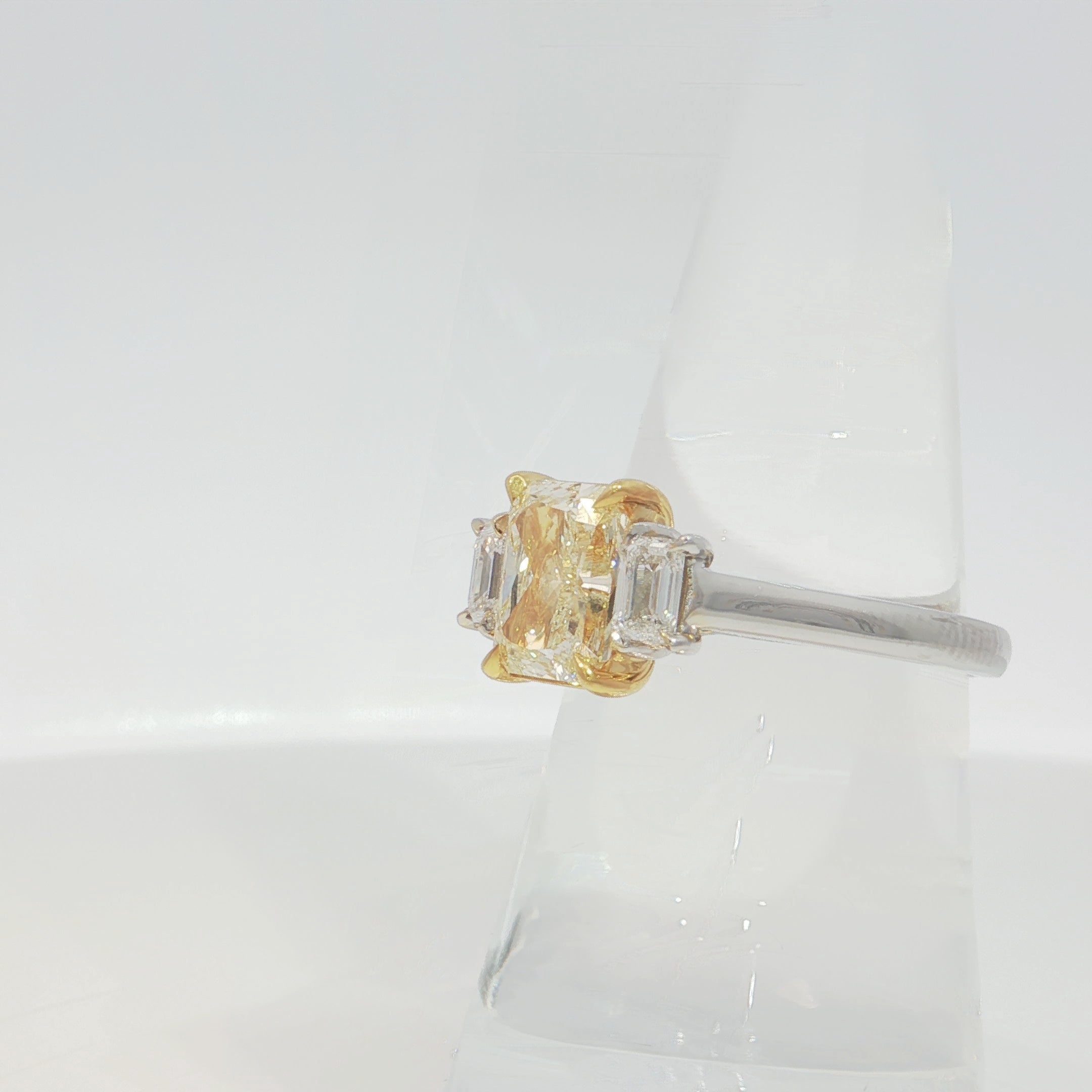 Refined and radiant, this elegant ring features a striking rectangular yellow diamond at its center, set in warm yellow gold prongs to enhance its golden hue. Flanked by sleek emerald-cut white diamond side stones, the design offers a beautiful contrast against the polished platinum metal band. Timeless and sophisticated, this three-stone ring captures classic luxury with a modern, elevated presence.
