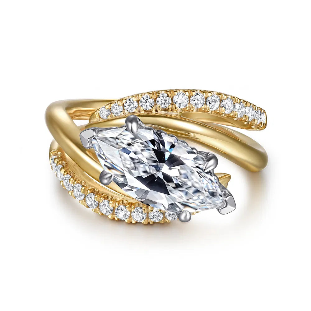A striking blend of modern elegance and timeless beauty, this bypass ring features a marquise-shaped diamond at its center. The flowing two-tone white and yellow gold band enhances the diamond’s brilliance, creating a unique, sophisticated look that’s both classic and contemporary.