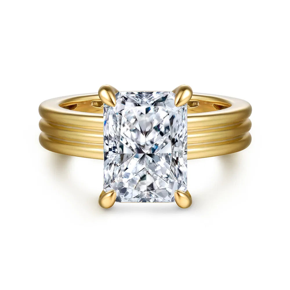 This wide band engagement ring features a stunning radiant cut diamond at its center, offering a perfect balance of sleek lines and brilliant sparkle. Subtle diamond accents along the gallery rail add a touch of understated shimmer, enhancing the beauty of the center stone without overpowering it. Crafted for both elegance and presence, the bold band provides a luxurious feel while maintaining a timeless, sophisticated design.