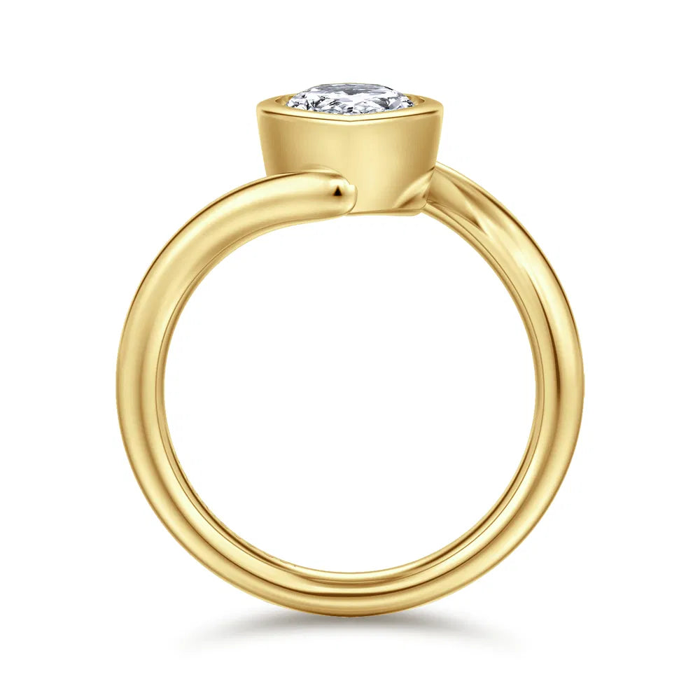 This elegant ring features a striking pear cut diamond embraced by a fluid bypass-style gold band. The sweeping curves cradle the stone with modern grace, creating a sculptural look that feels both bold and refined. A perfect blend of artistry and sophistication.