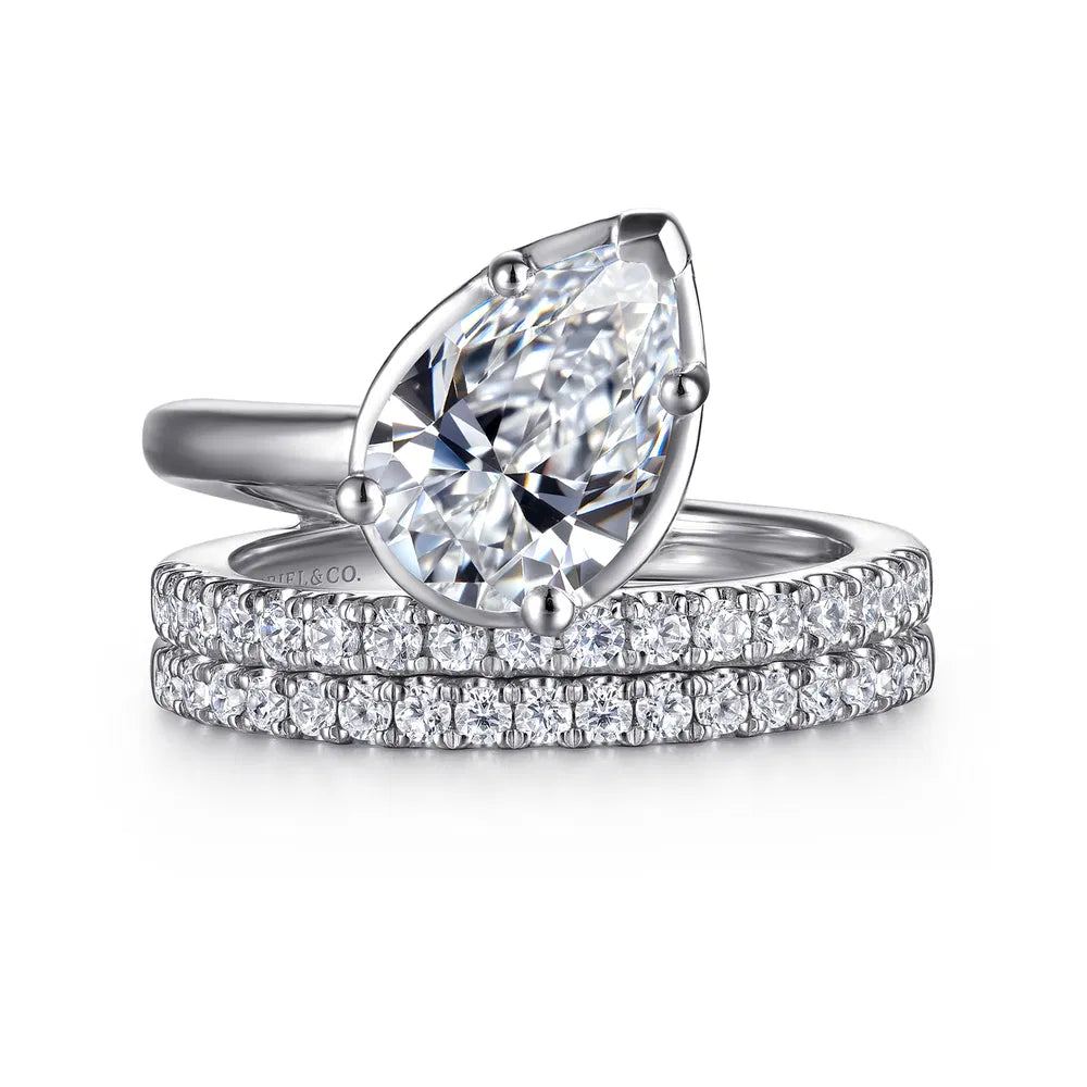 This pear-shaped diamond engagement ring makes a striking statement with its modern wrap design and refined elegance. A pear cut center stone is secured by sleek prongs, while a diamond-adorned band gracefully curves around it, creating a captivating sense of movement and brilliance. Designed to balance bold presence with timeless sophistication, this ring is perfect for the woman who embraces contemporary beauty with a romantic edge.