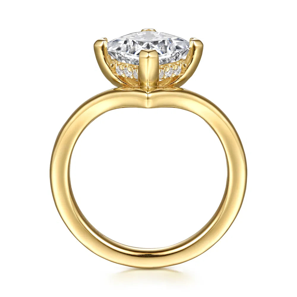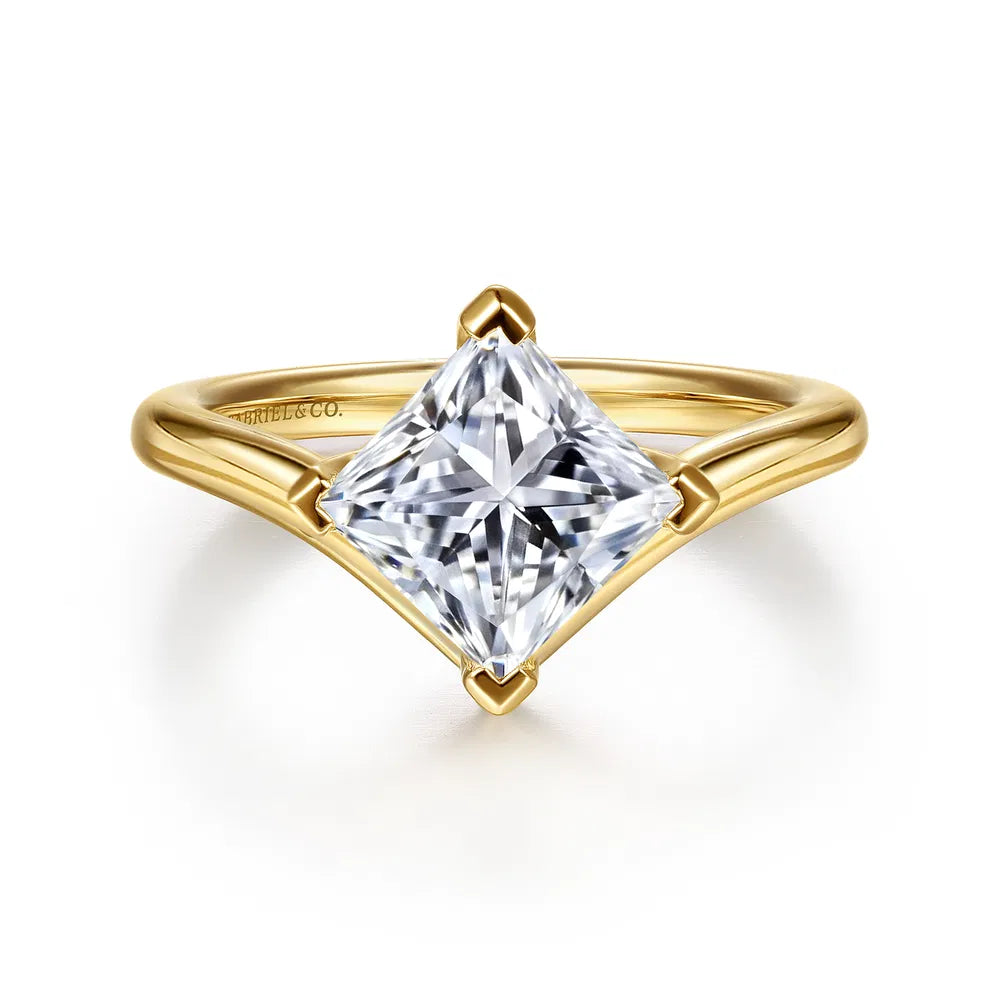 This stunning ring showcases a brilliant princess-cut diamond set in a modern chevron-style gold band. A delicate hidden halo of pavé diamonds rests beneath the center stone, adding a subtle layer of sparkle that catches the light from every angle. With its clean lines, sculptural prongs, and warm golden glow, this design offers a perfect blend of contemporary elegance and timeless sophistication—ideal for someone who loves a classic look with a unique twist.