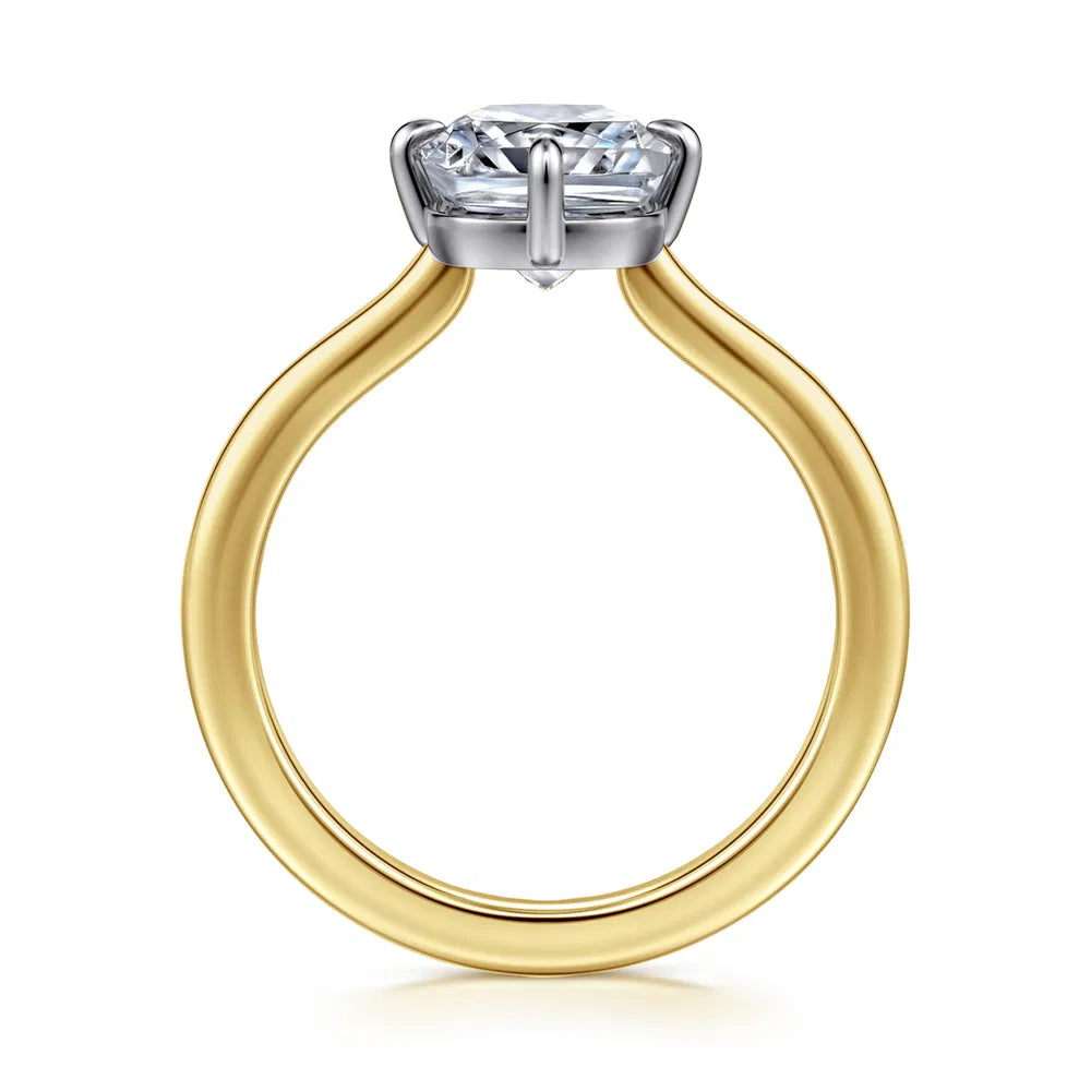 A stunning blend of modern design and timeless elegance, this ring features an elongated cushion-cut diamond held securely by a compass prong setting, allowing maximum light to enhance its brilliance. The two-tone white and yellow gold band adds depth and sophistication, creating a striking contrast that highlights the diamond’s sparkle. Perfect for someone seeking a classic solitaire with a contemporary twist.